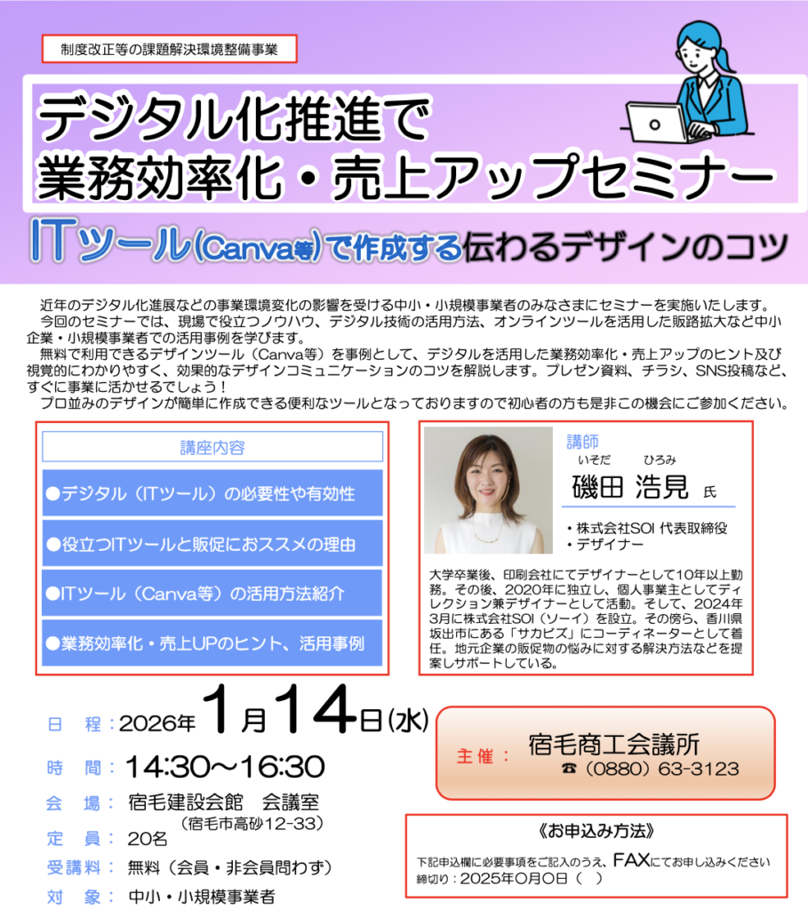 セミナー内容としては、地域事業者の皆さまがSNS発信や販促ツールをより効果的に活用できるよう、